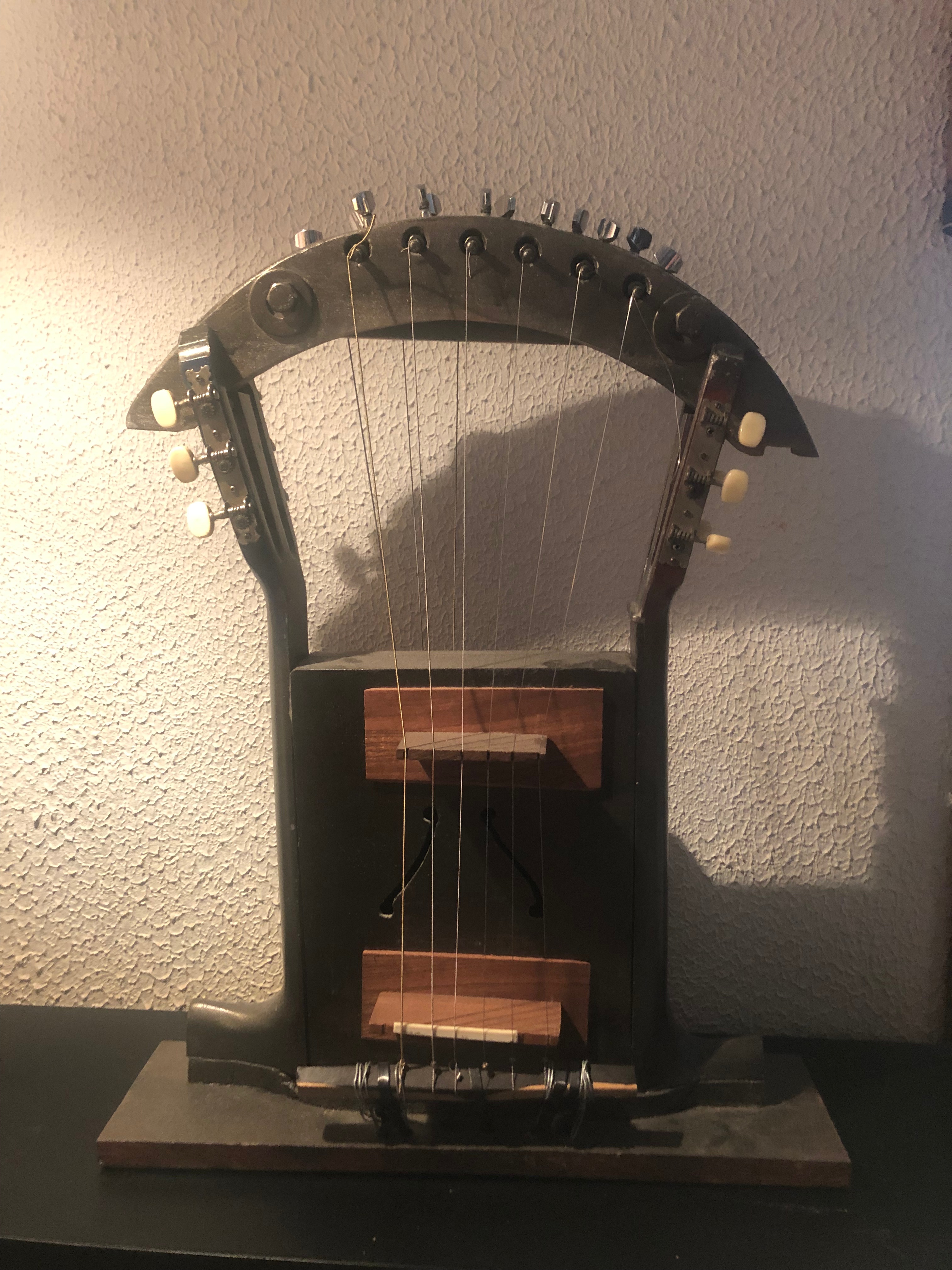 harpe avec boite en bois et sculpture